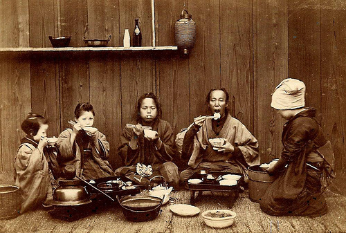 Основой питания в средневековой Японии являлись в первую очередь овощи (вареные и маринованные) и зерновые культуры (рис, ячмень, пшеница, просо, гречка). Рис выращивался не во всех провинциях, но он был, конечно, главной зерновой культурой. Достаточно заметить, что одно и то же слово обозначает в японском языке приготовленный рис и еду вообще – гохан. В меньшей степени была доступна рыба. Холодильников не было, транспорт медленный, поэтому свежая рыба была доступна только на побережье, а в глубине страны - только вяленая. Еще в меньшей степени были употребительны мясо и сладости. Сахар вообще позиционировался как лекарство. Часто даже в семьях самураев только хозяину подавали вареный рис или другие злаки с небольшим количеством рыбы или другого гарнира, в то время как остальные члены семьи и слуги питались супом и овощами. Самураи питались лучше, чем остальное население, но, в общем, рацион не был обильным.
