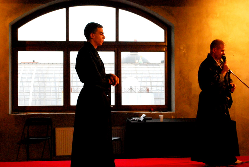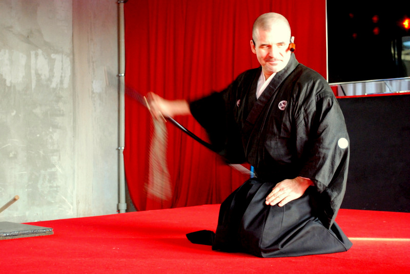 Проводит куратор выставки, мастер меча Юрий Аистов (4 дан, Мусо Дзикиден Эйсин Рю Сейто Сэйдэн)
