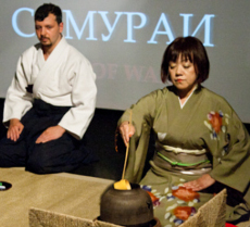 Церемонию ведет Хитоми Сомата, ученица Акияма Соти сэнсэя, сертификат Урасэнкэ Кёдзю (Япония).