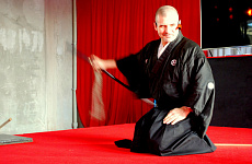 Проводит куратор выставки, мастер меча Юрий Аистов (4 дан, Мусо Дзикиден Эйсин Рю Сейто Сэйдэн)